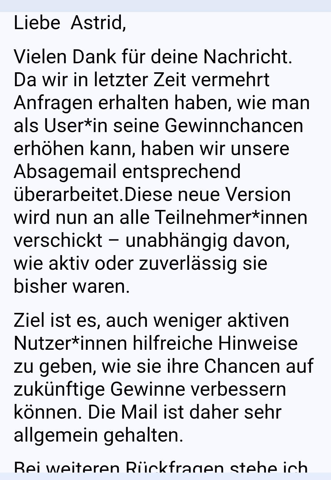 Ich finde es teilweise sehr schwierig nachzuvollziehen warum man kein Glück hat. Denn wenn zb in der Mail kritisiert wird, dass man die Bewerbungsfrage authentisch und ausführlich beantwortet soll und dann sieht man, dass Leute gewinnen die darauf mit einem einzelnen Wort antworten, finde ich das widersprüchlich.