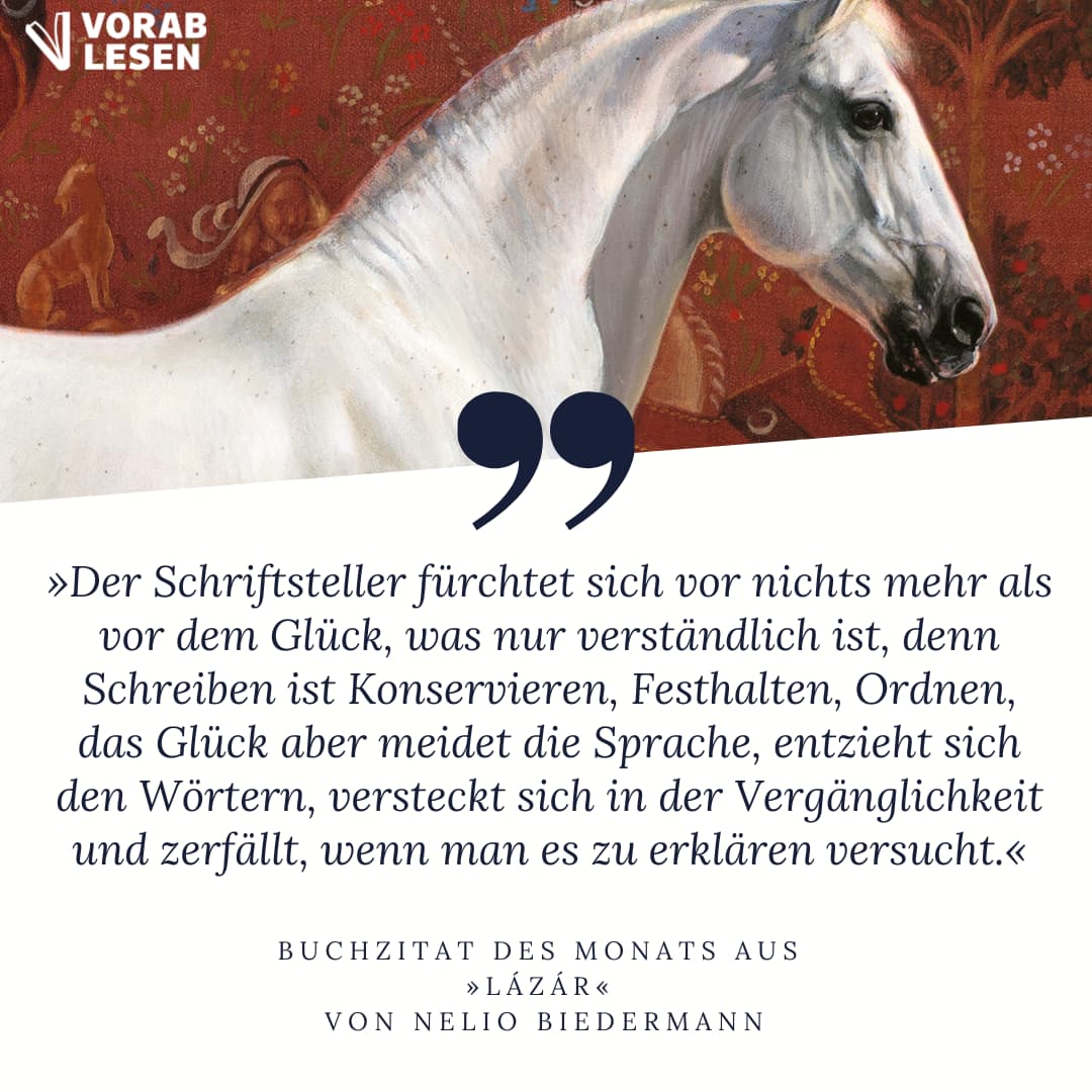 Das Buchzitat im August stammt aus „Lázár“ von Nelio Biedermann und lautet: