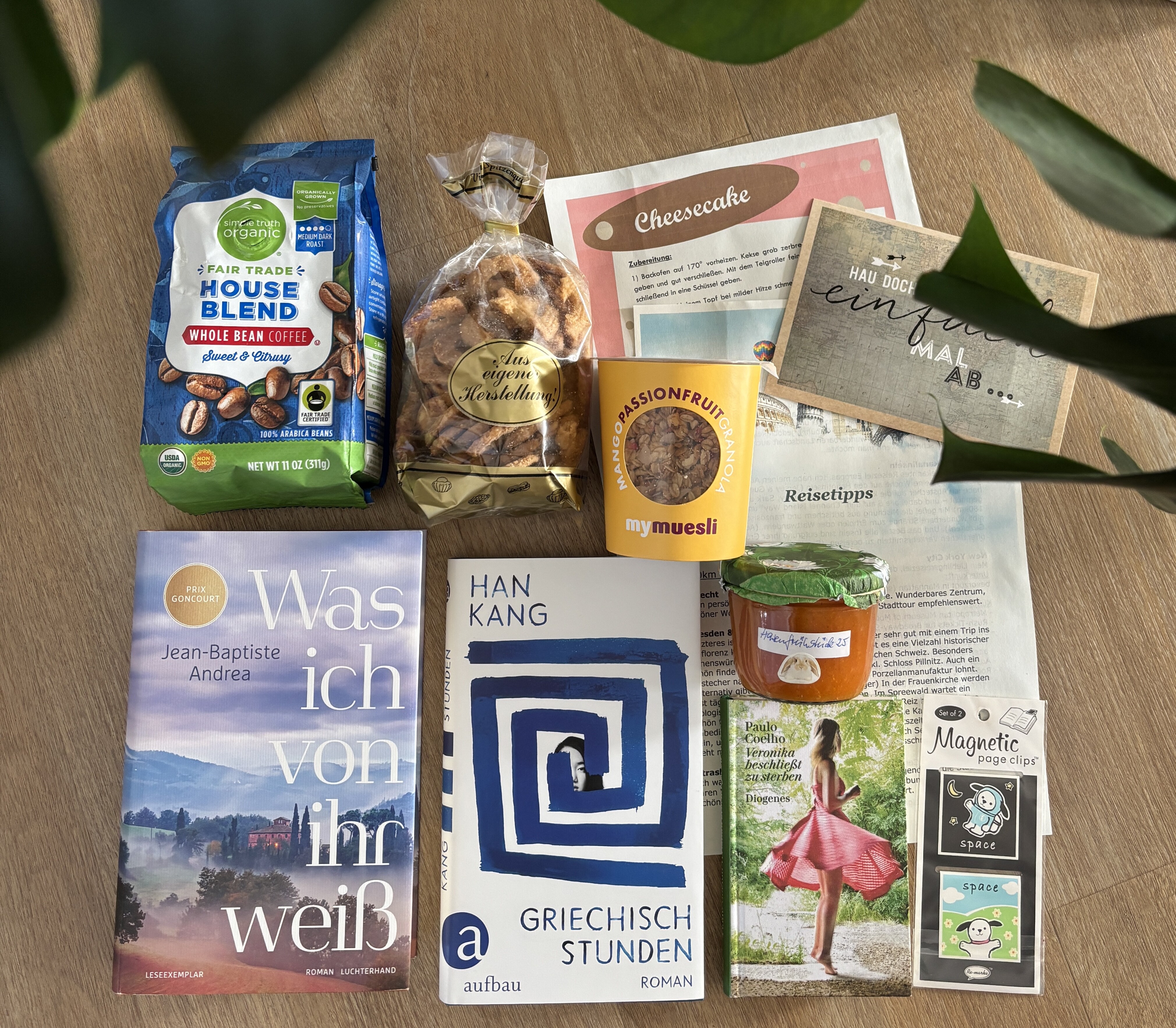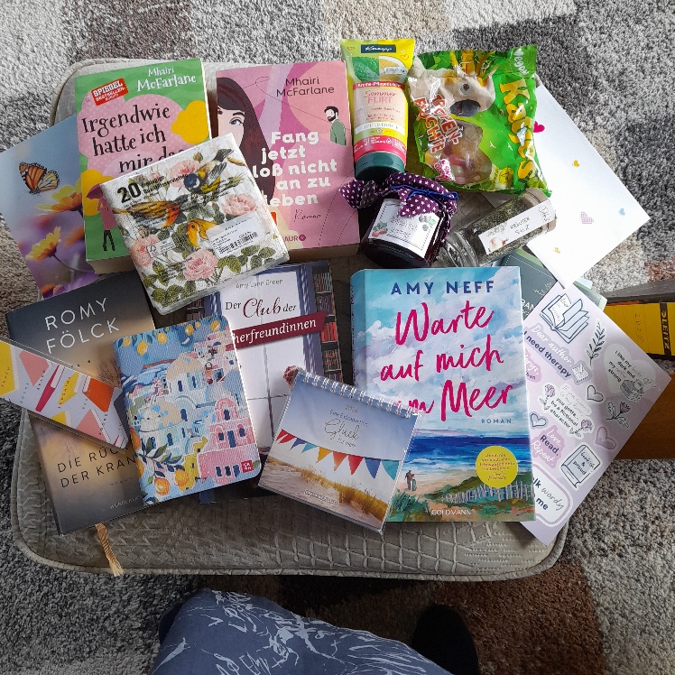 Mein Paket ist da und es war eine große Freude, es auszupacken. Danke liebe Ulla für Dein schönes Paket, bzw. den tollen Inhalt. Gleich 4 meiner Wunschbücher und noch eine Leseempfehlung von Dir- toll,toll,toll. Auch Die kleinen Beigaben haben mich sehr gefreut. Für die fernen Bewunderer meines schönen Paketes hier eine kleine Aufzählung: kleine Sticker für Buchfreunde, eine leckere Marmelade, ein Kräutersalz, ein wunderschönes sommerliches Notizheftchen, ein kleiner Glücksbringer für das Jahr 2026, ein Lesezeichen, ein sommerliches Duschgel, ein paar leckere Gummitierchen, wunderschöne sommerliche Servietten und Deine nützlichen Reiseempfehlungen. Ich habe mich wirklich riesig gefreut.