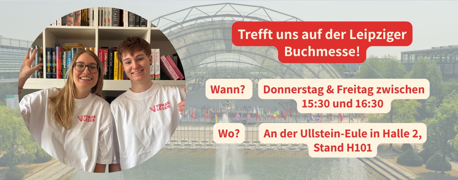 Ihr findet uns Donnerstag und Freitag zwischen 15:30 und 16:30 an der Ullstein-Eule in Halle 2, Stand H101! Ihr erkennt uns an den Vorablesen T-Shirts