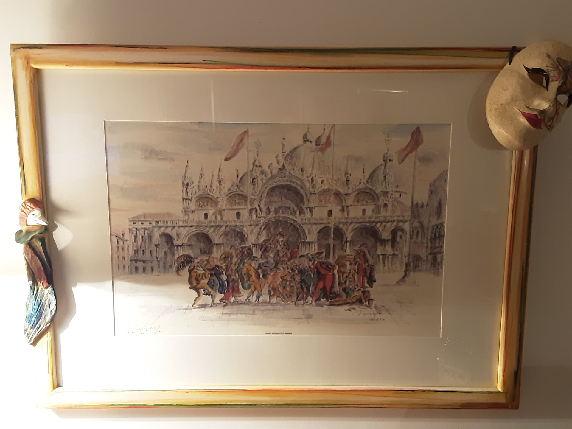 Das ist übrigens meine Ganzjahres-Karnevals-Deko im Wohnzimmer. Maske und Bild sind aus Venedig, den Rahmen habe ich hier daheim passend anfertigen lassen.