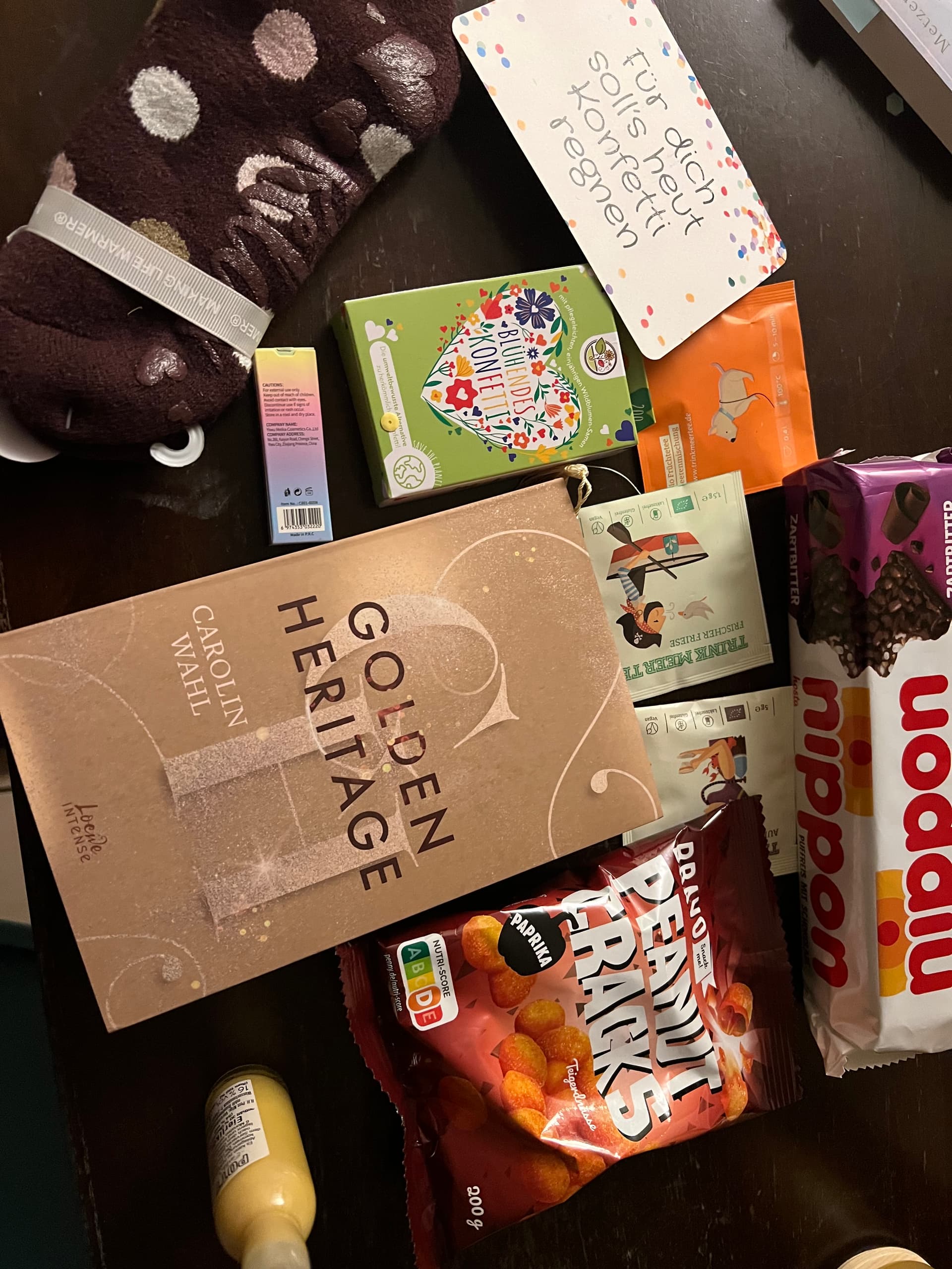Meine Geschenke passen auch zu 100% zu mir. Die Socken… sie sind offenbar sehr bequem… der Likör… (da war dann wohl der interne Zoll drauf ;))… die Snacks… der Glitzerstift… die Samen durfte ich direkt abgeben- du weißt, wer den grünen Daumen hier hat (danke vielmals!). Und der Tee ist toll. Das ich mich über das Buch gefreut habe, ist außer Frage. Vielen lieben Dank.