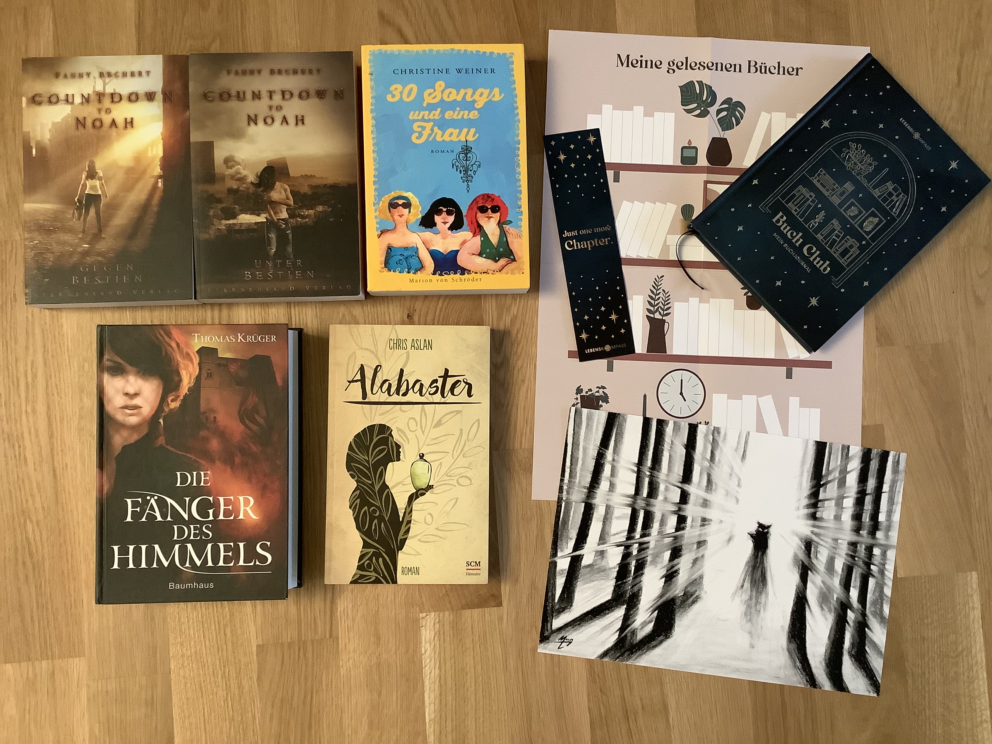 oben 3 Tauschbücher, unten 2 Zusatzbücher, rechts die Goodies. Das Buchjournal sieht so schön aus dass ich gar nicht reinschreiben mag