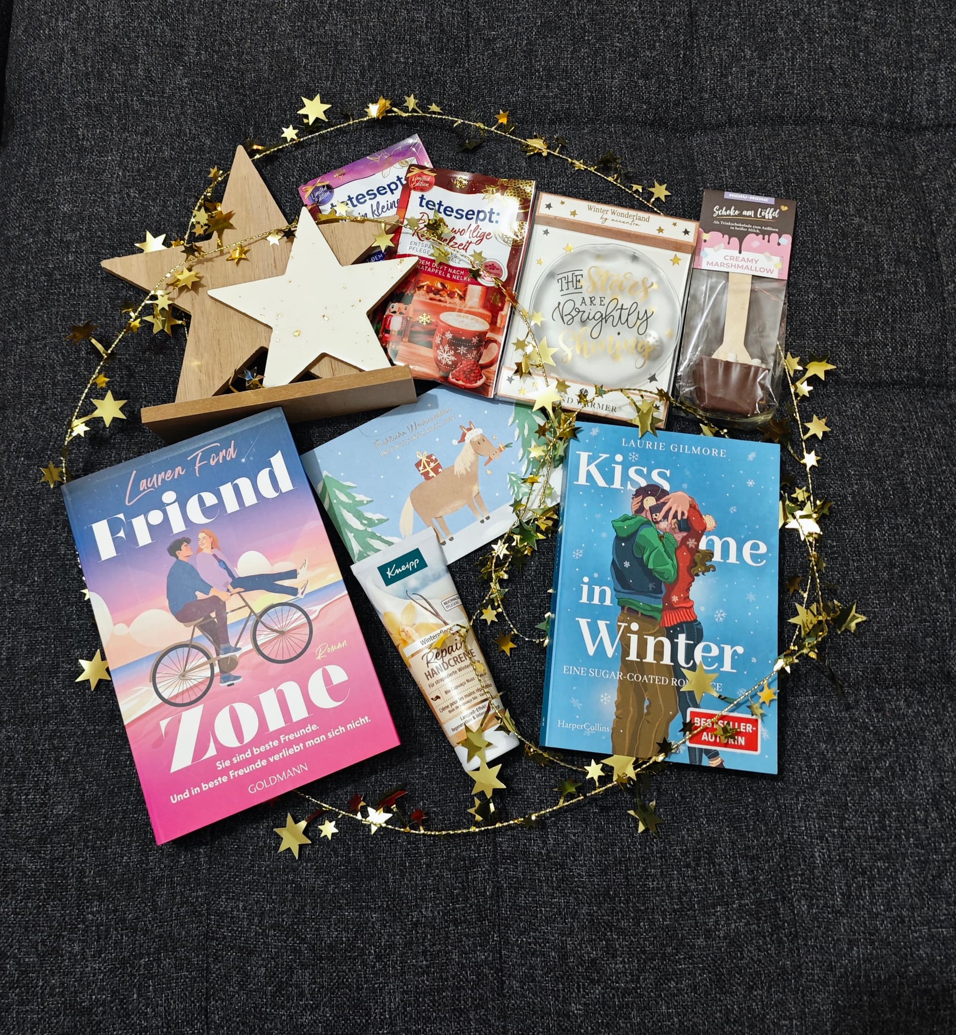 einfach alles hat meinen Geschmack getroffen … Die Deko, die tollen Badezusätze, die Creme und der Handwärmer … Einfach alles! Über mein Wunschbuch habe ich mich super gefreut und auch das Überraschungsbuch trifft voll meinen Geschmack und ich kannte es bisher noch gar nicht! Alles in allem war dieser Wichtelrunde wieder wahnsinnig schön und ich freue sehr!