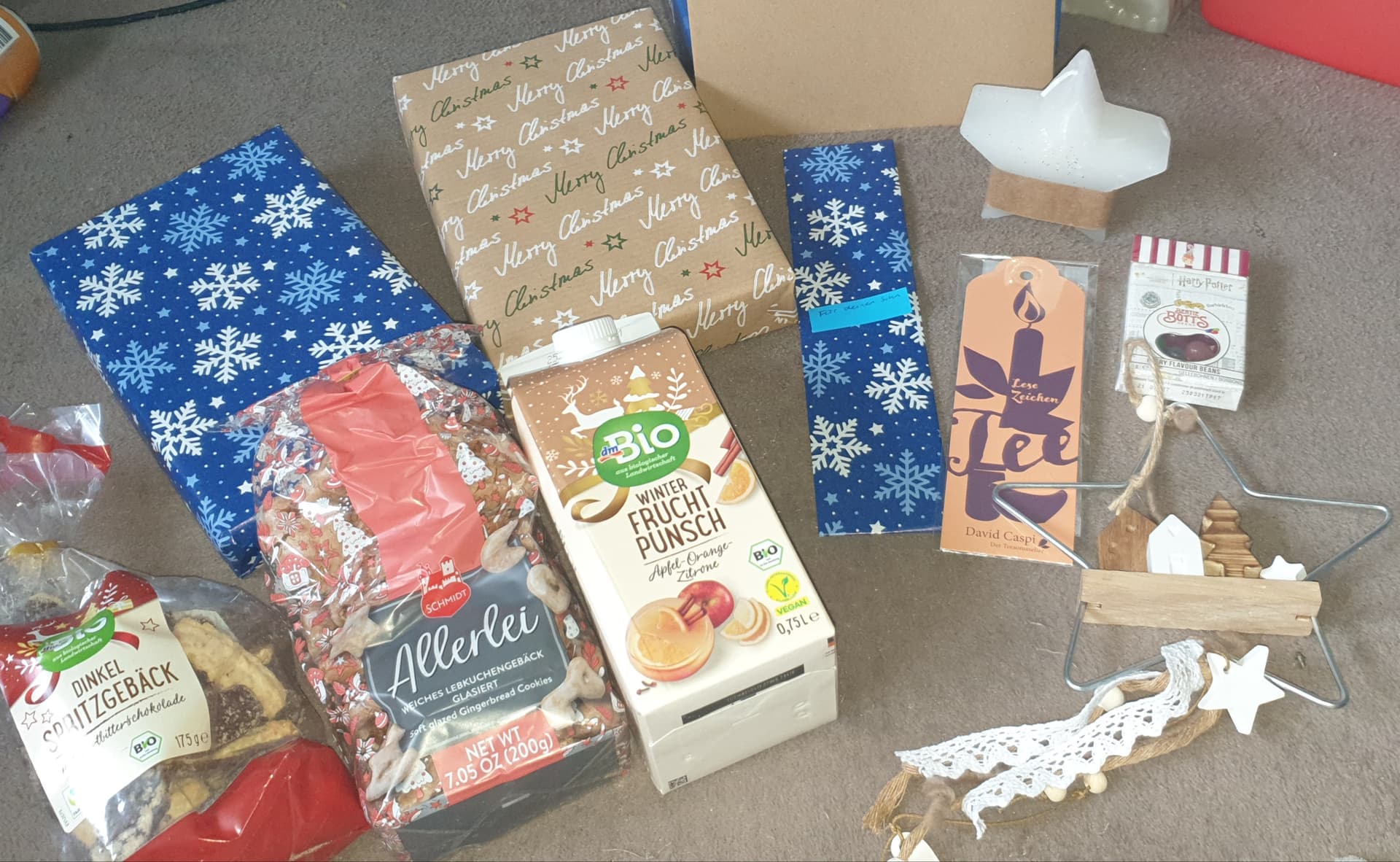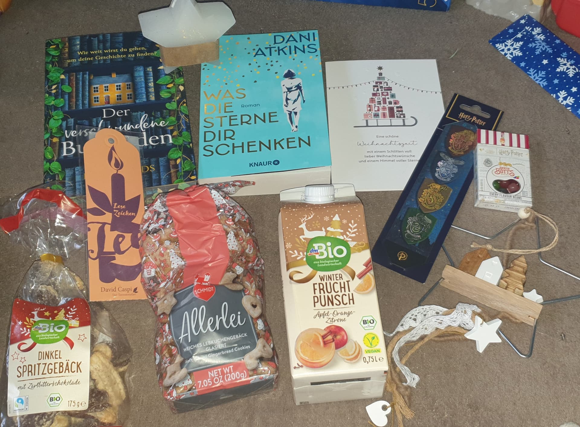 Die Stern-Deko mit den Häuschen habe ich auf einem Weihnachtsmarkt entdeckt und musste sie einfach mitnehmen. Und die Harry Potter Bonbons fand ich selbst so lustig.