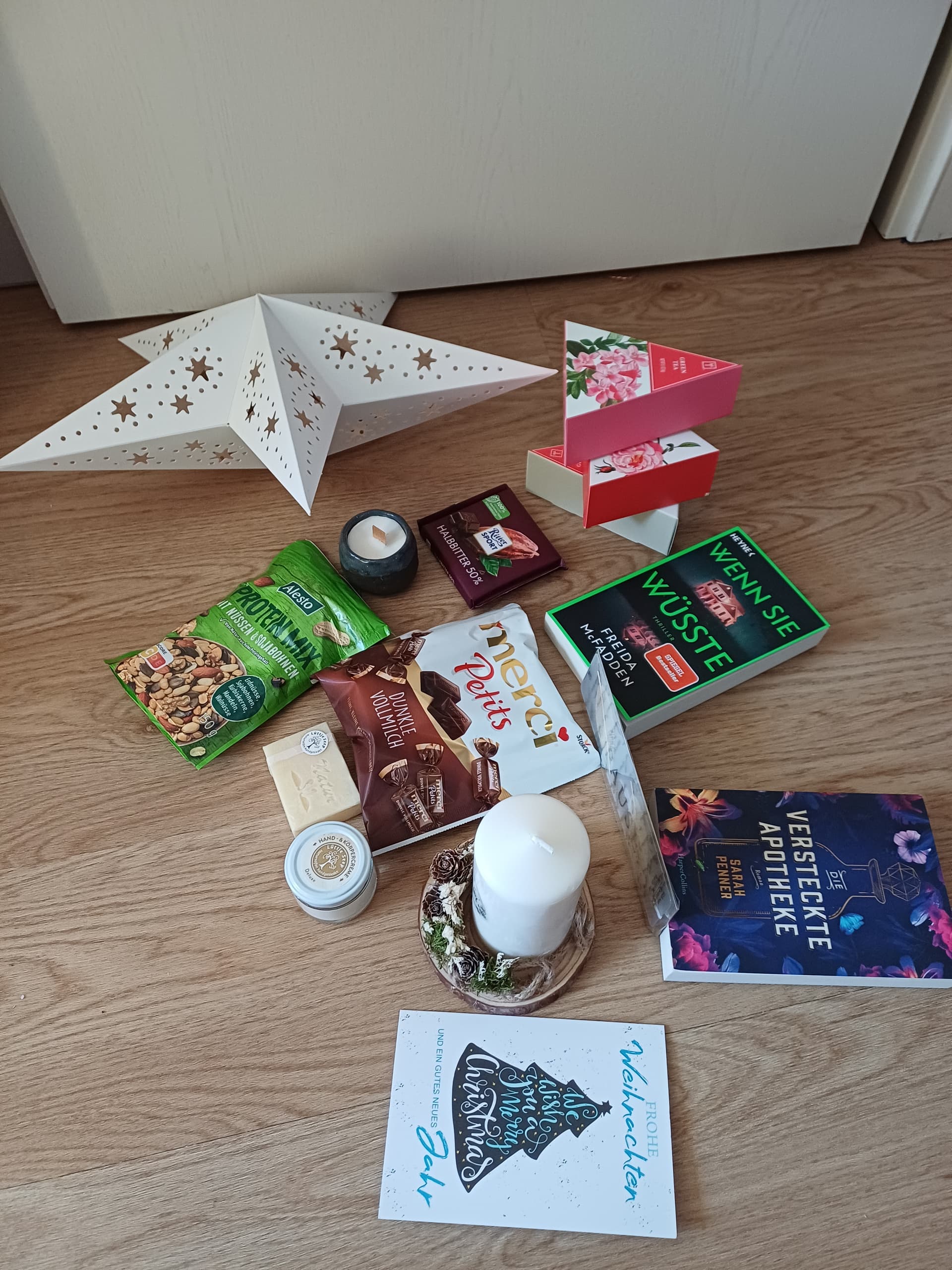 Bevor gleich meine Tochter mit ihrem Freund kommt, wollte ich in Ruhe das tolle Päckchen von Ute/Livahn Auspacken. Meine Güte so viele Geschenke und dann dieses schöne Sternengeschenkpapier. Du hast Dir so viele Gedanken gemacht und meinen Geschmack zu 100 % getroffen. Die Teeverpackung ist cool. Und auf die Hand und Körpercreme bin ich gespannt. Die schöne Kerze kommt gleich auf den Kaffeetisch und mein Mann darf den Stern ins Küchenfenster hängen (wozu hat man einen Mann😆) und das Fenster ist mir eh zu leer. Die Bücher sind perfekt und ich freue mich sehr darauf sie zu lesen. Dabei werde ich die Nüsse naschen