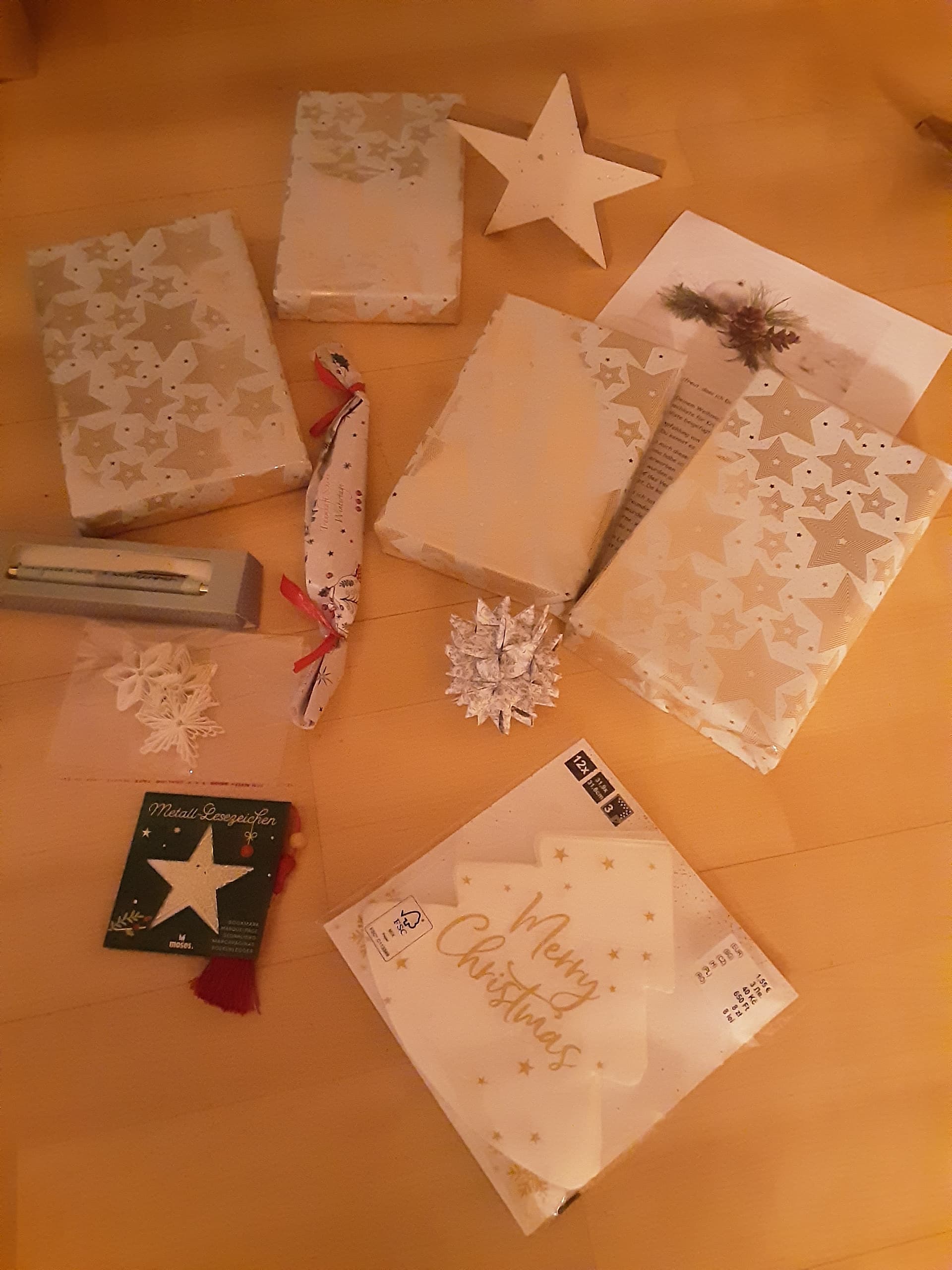 Die tollen Beigaben sind diesmal der absolute Höhepunkt, total edel und absolut meins! Und auch noch so passend zum Sternenthema! Das wunderbare Sternen-Lesezeichen ist sofort in meine aktuelle weihnachtliche Lektüre gewandert („Alle unter eine Tanne“). Den tollen Papierstern hast Du so super selbst gebastelt, fantastisch! Der liebevolle Kuli wird mich bei meinen Notizen gerne begleiten und ganz gespannt bin ich auf diesen besonderen Nougat-Riegel von einem familiären heimischen Hersteller, ich liebe ja Nougat! Danke auch für Deine lieben Zeilen! Ich habe mich sehr gefreut, dass wir uns dieses Jahr gegenseitig bewichteln durften, Du hast mein Weihnachtsfest erhellt, fühle Dich von mir gedrückt!